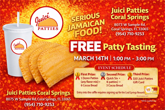 Join Juici Patties Coral Springs for a FREE Patty Tasting Event on March 14th from 1:00 PM – 3:00 PM!